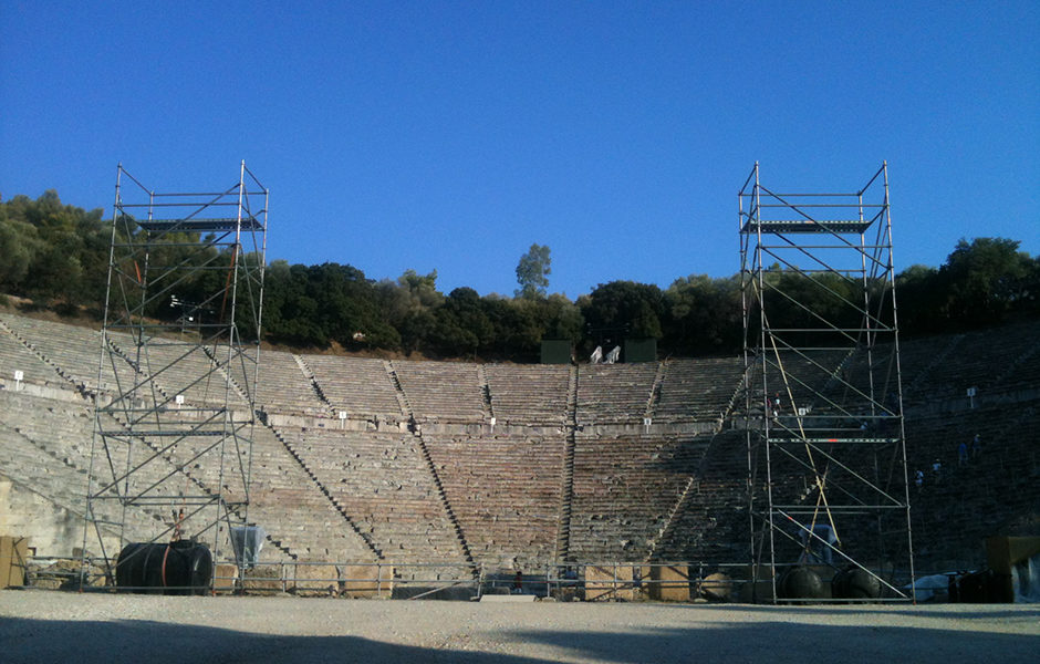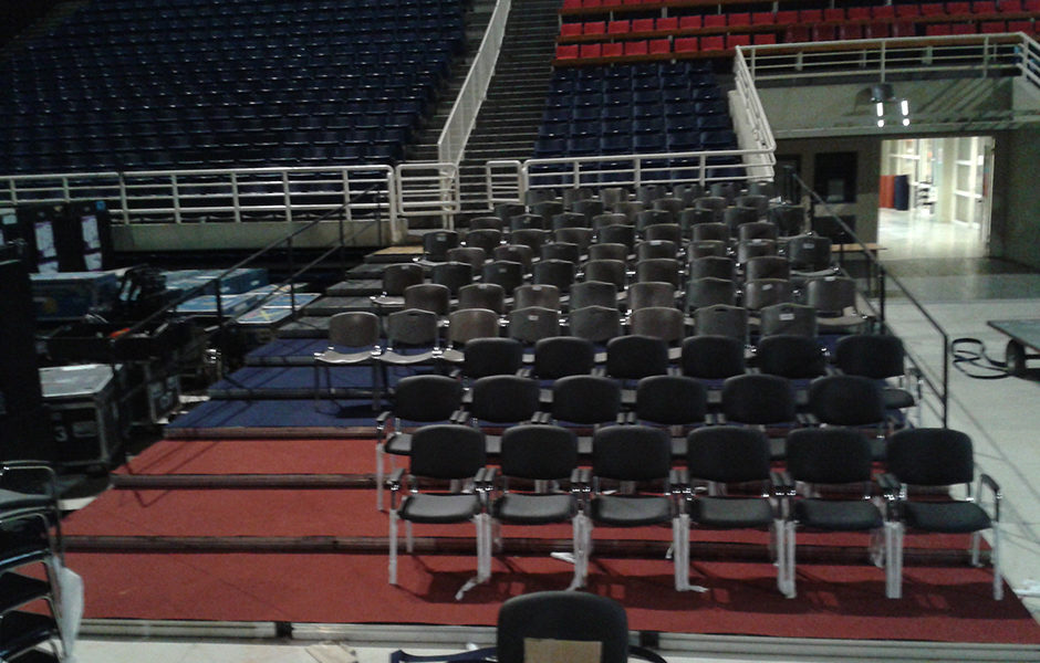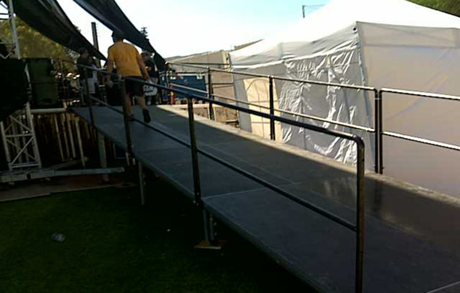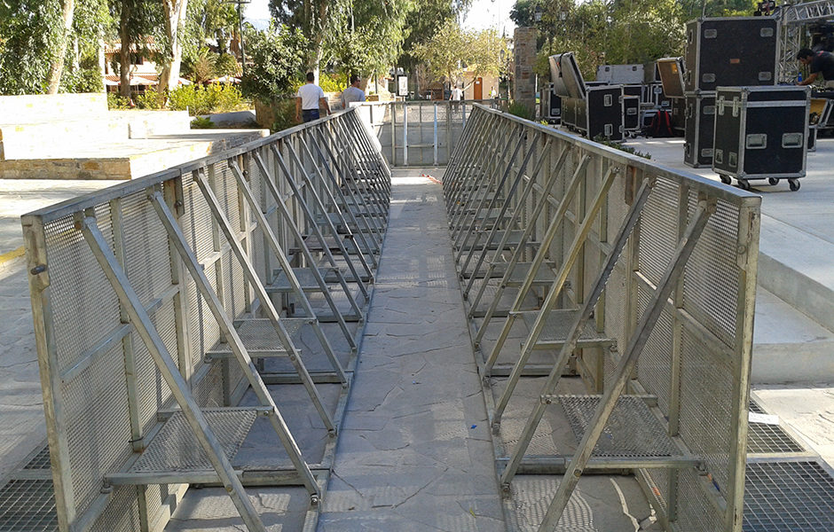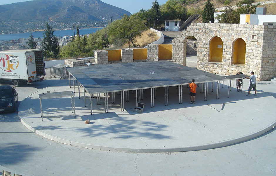 Σκαλωσιές - Ικριώματα τύπου Layher με γενική χρήση σε συναυλιακούς και εκθεσιακούς χώρους καθώς και για τηλεοπτικές παραγωγές. Αρχικό ύψος κατασκευής 0.50 cm και ύψος ανάλογα με τις απαιτήσεις. Μπορεί να γίνει και η κατασκευή κλιμακοστασίου με εσωτερική σκάλα.